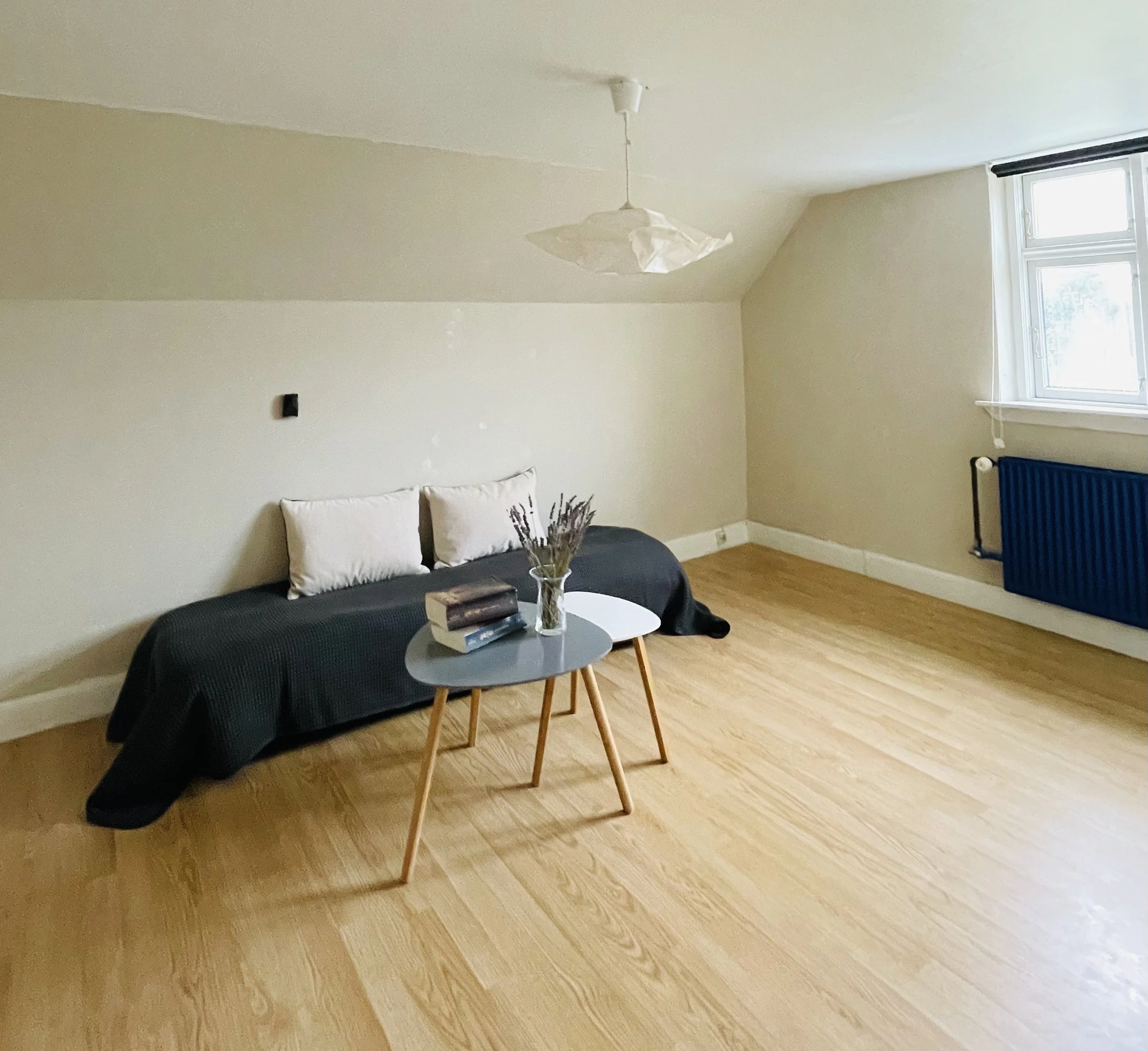 Dette værelse var også brugt som opbevaringsrum, og vi besluttede at gøre det lyst og rummeligt, så man kunne se det fine gulv.